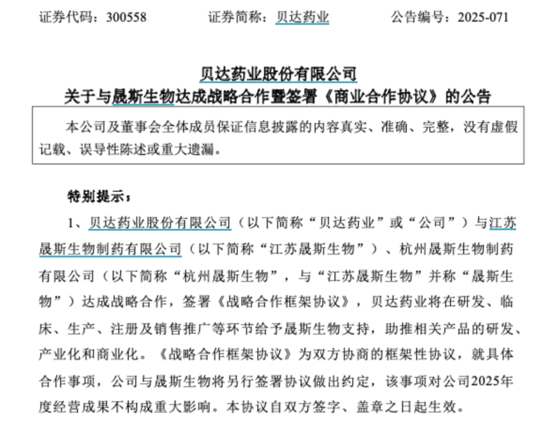 公告顯示,為進(jìn)一步拓展公司新藥創(chuàng)新技術(shù)平臺(tái),豐富產(chǎn)品管線布局,近日,貝達(dá)藥業(yè)與江蘇晟斯生物、杭州晟斯生物達(dá)成戰(zhàn)略合作,簽署《戰(zhàn)略合作框架協(xié)議》,貝達(dá)藥業(yè)將在研發(fā)、臨床、生產(chǎn)、注冊(cè)及銷(xiāo)售推廣等環(huán)節(jié)給予晟斯生物支持,助推相關(guān)產(chǎn)品的研發(fā)、產(chǎn)業(yè)化和商業(yè)化。
